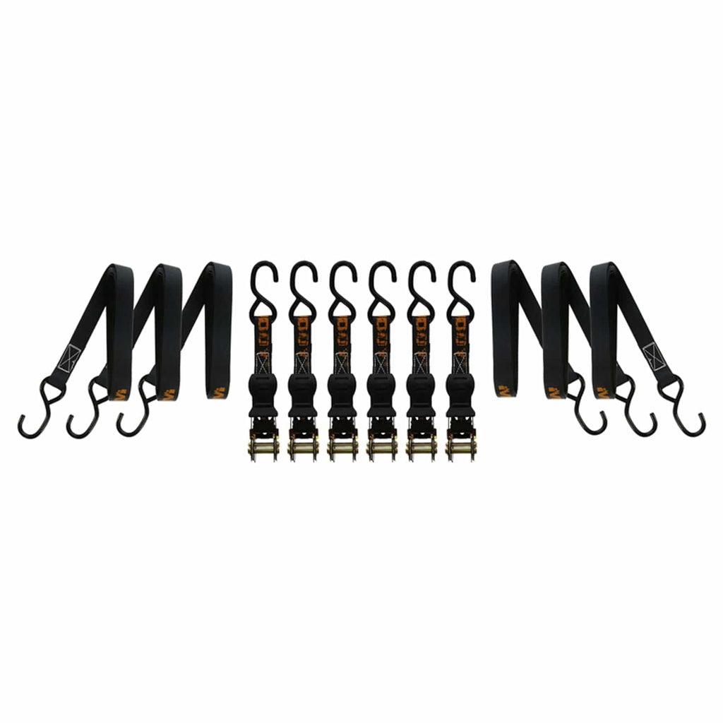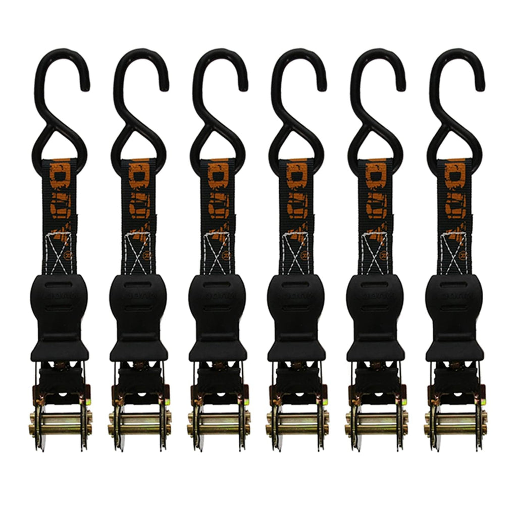 Keep your cargo secure with this 6 pack of durable Ratchet Straps from Muddy. With 1,500-lb. breaking strength, these 1 in. x 14-ft. long straps provide you with the confidence you need so you won’t have to worry about your cargo going anywhere. Coated hooks help secure the cargo in place. Get peace of mind. Get Muddy Ratchet Straps.