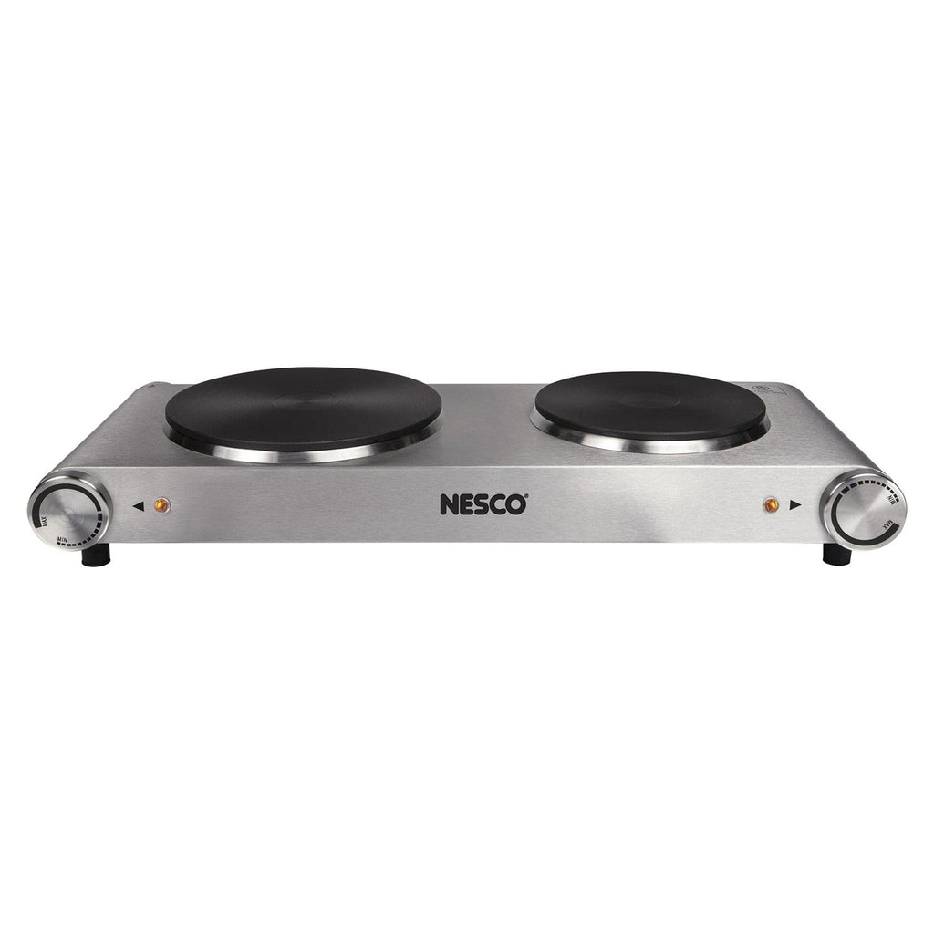 The Nesco Double Burner Electric Hot Plate is the ideal alternative to a regular-sized stove if you’re limited on kitchen space or are traveling. This easy-to-use cast-iron hot plate has 2 individual cast iron burners, each with separate temperature controls, giving you the option of using either or both. Power indicator lights will illuminate when the burner plates are on and warming to the desired setting, then cycle on and off during use as they maintain the ideal temperature. This hot plate includes a thermal fuse for overheating protection which ensures safe use and proper temperatures. It also features skidproof rubber feet for stability. Use this Nesco Double Burner Hot Plate for preparing meals at home or on the go!