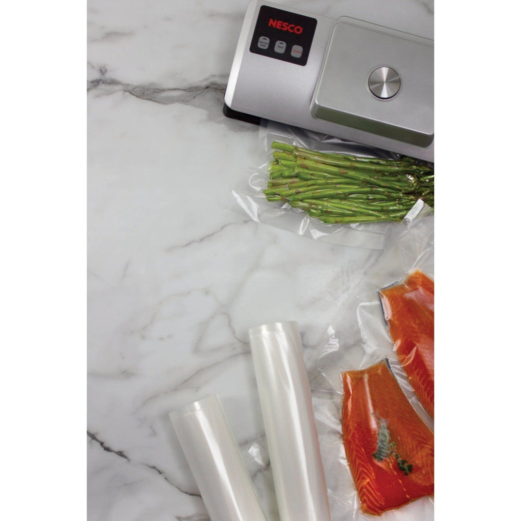 Nesco/American Harvest’s patented 8 in. x 20 in. bagging material is specially designed to lock in freshness and flavor by keeping air, moisture, and odors out. The multilayer construction is tear-resistant and features cross-venting channels on both sides allowing for maximum air extraction. It is BPA-free and safe to microwave, boil and freeze. You can even put them in the dishwasher and reuse. 2 pack.
