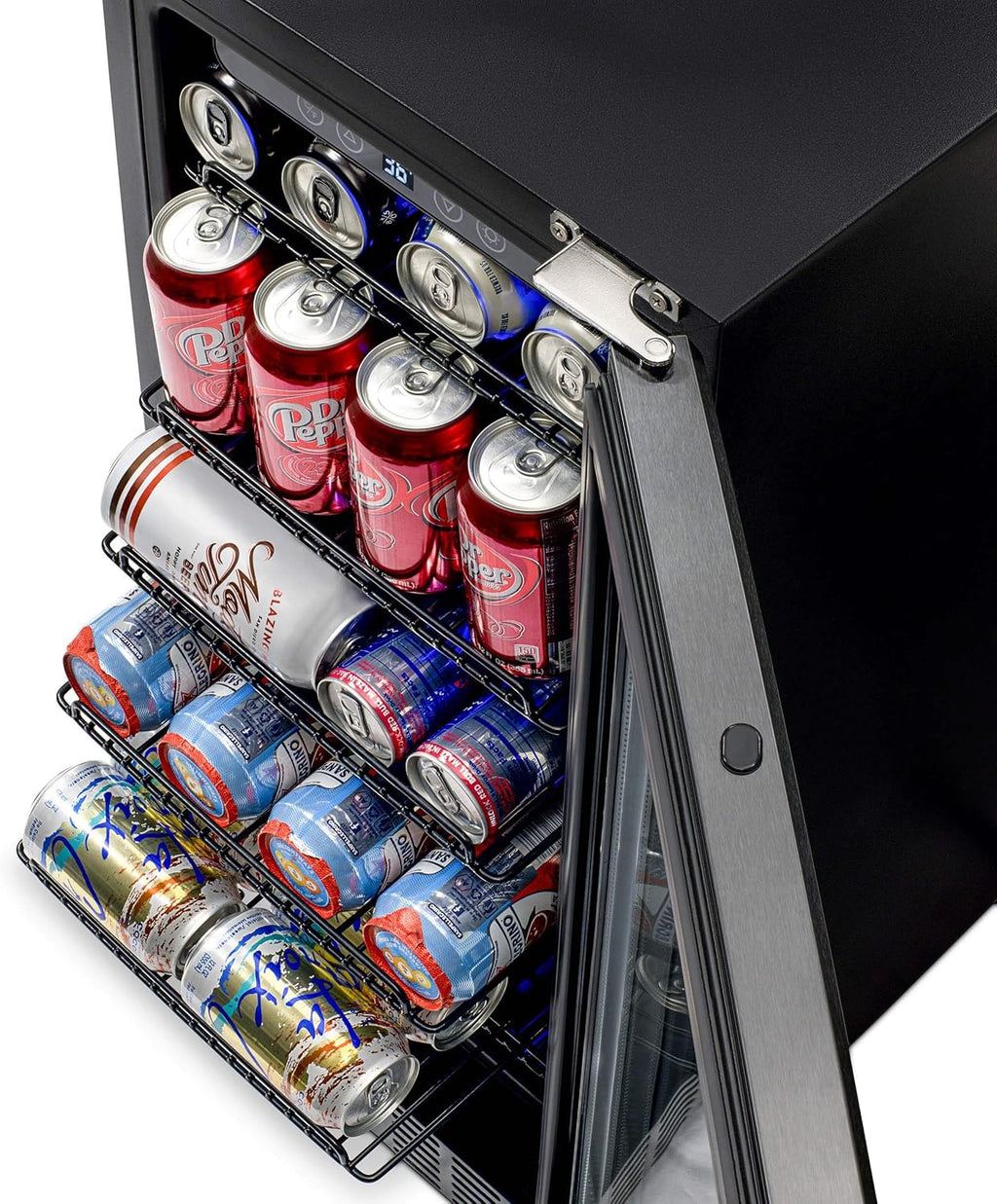 - [COMPACT DESIGN] - Even though it's only 15 inches wide, this beverage fridge still holds up to 96 standard cans — that's eight full six-packs of drinks. The attractive black stainless steel finish makes it a classic choice for kitchens, home bars and more.