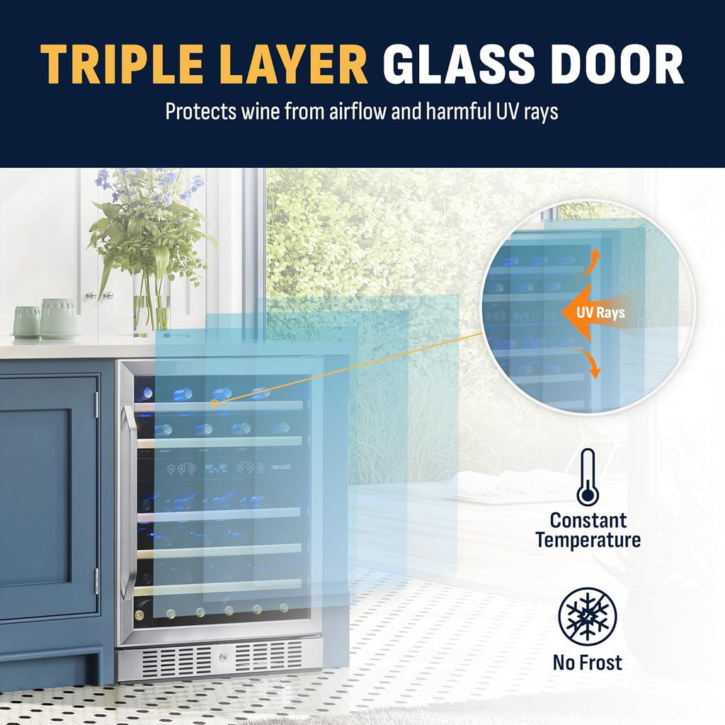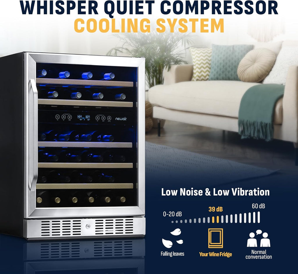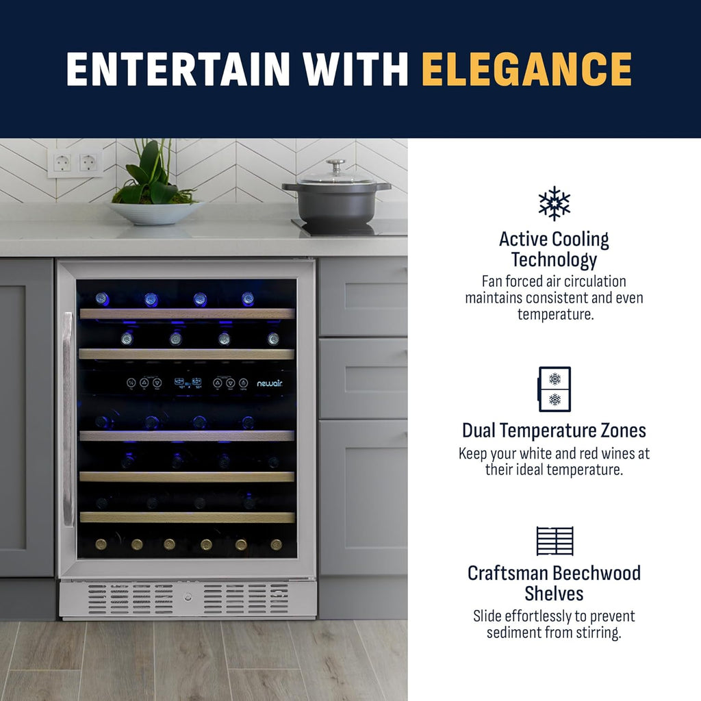 The Newair 24” Built-In Dual Zone 46 Bottle Wine Fridge is the perfect upgrade for any home bar or custom kitchen. Designed for seamless built-in installation or freestanding use, this premium wine cooler features a sleek stainless steel design and front-venting system ideal for under-counter placement. Whether you're a casual wine enthusiast or a seasoned collector, this built-in wine refrigerator offers precise cooling and storage for both red and white wines, making it an essential addition to your wine storage setup. This dual zone wine fridge stores up to 46 bottles and features independent temperature settings: 40-55°F in the upper zone for whites, and 50-66°F in the lower zone for reds. The triple-tempered, UV-protected glass door add both functionality and style. Beech wood shelves glide smoothly for easy access, while a carbon filter keeps air fresh. Digital controls offer exact temperature adjustment, and the locking door ensures added security for your collection.