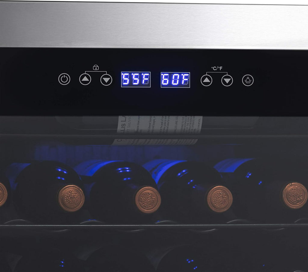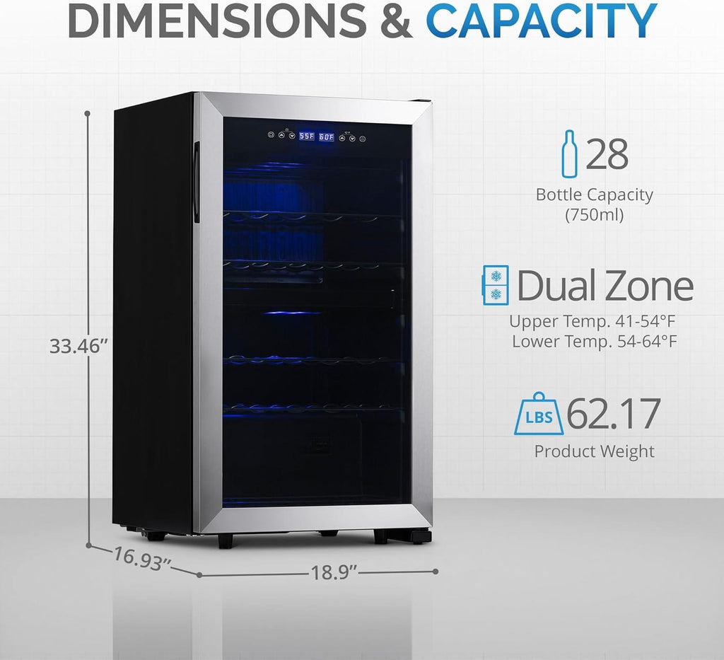 - [DUAL TEMPERATURE ZONES] - Get two wine coolers in one thanks to dual-zone cooling for up to 28 standard wine bottles. Store white wine from 40 to 55 degrees in the upper zone and red wine from 50 to 66 degrees in the lower zone.