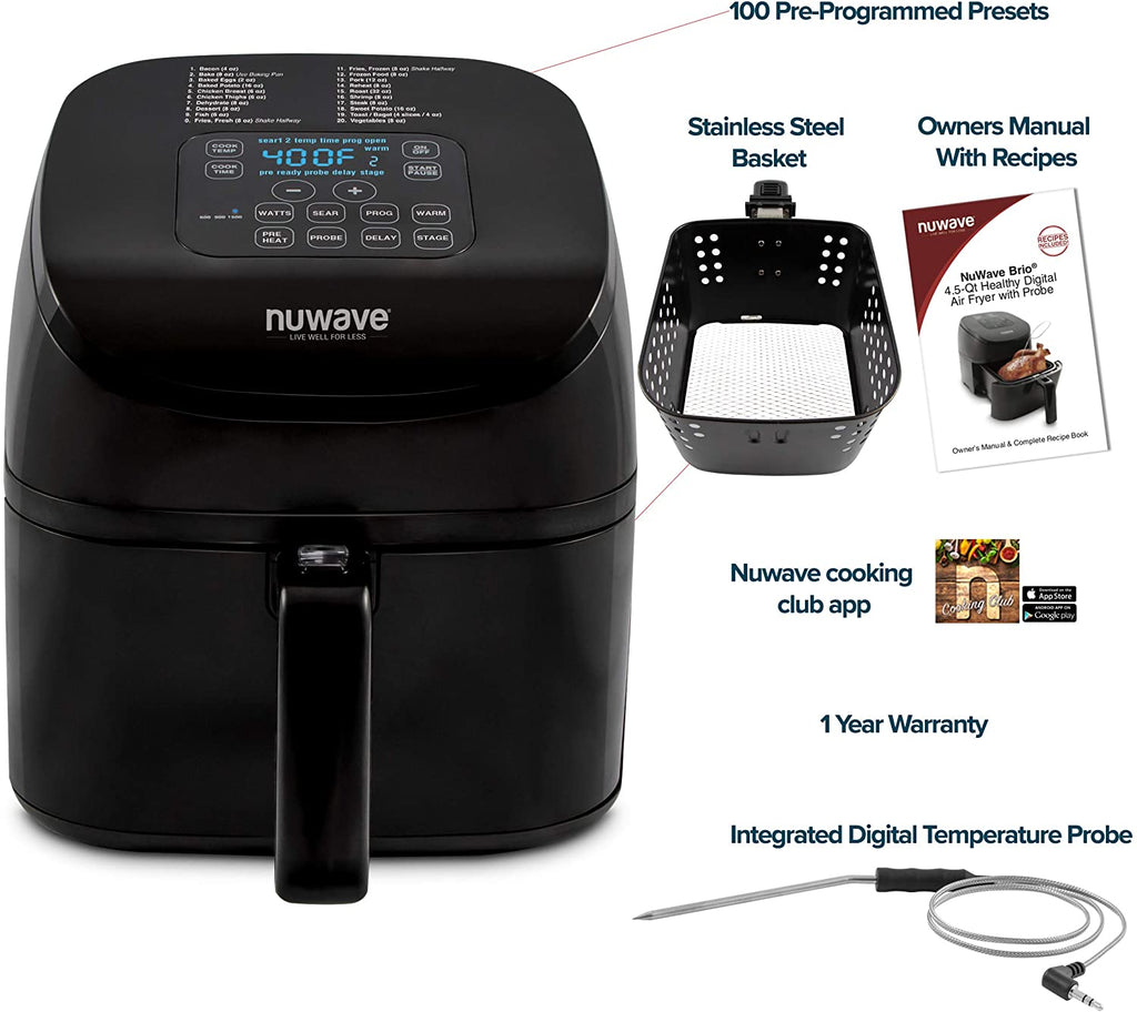 Every BRIO includes the all metal basket and cooking chamber, integrated temperature probe, owner’s manual with recipes, 100 preprogrammed presets and Nuwave cooking club app.
