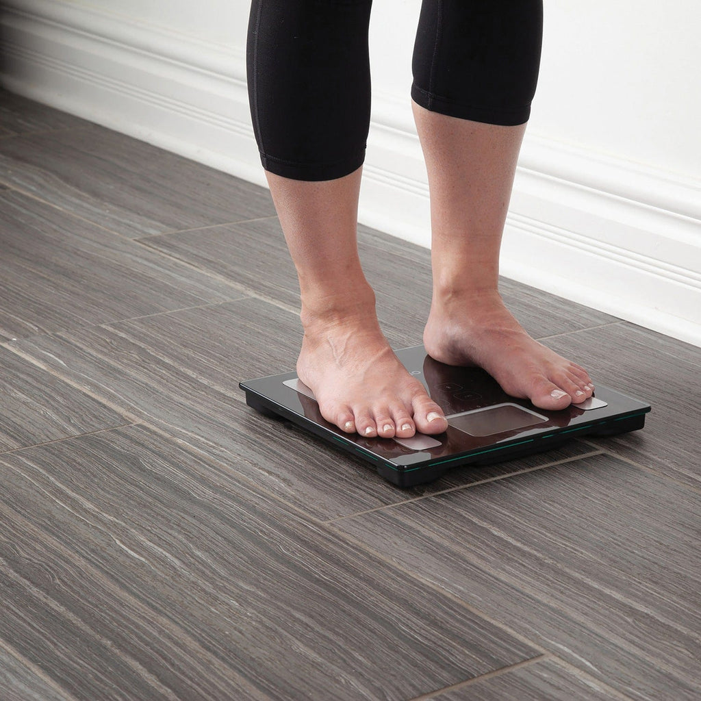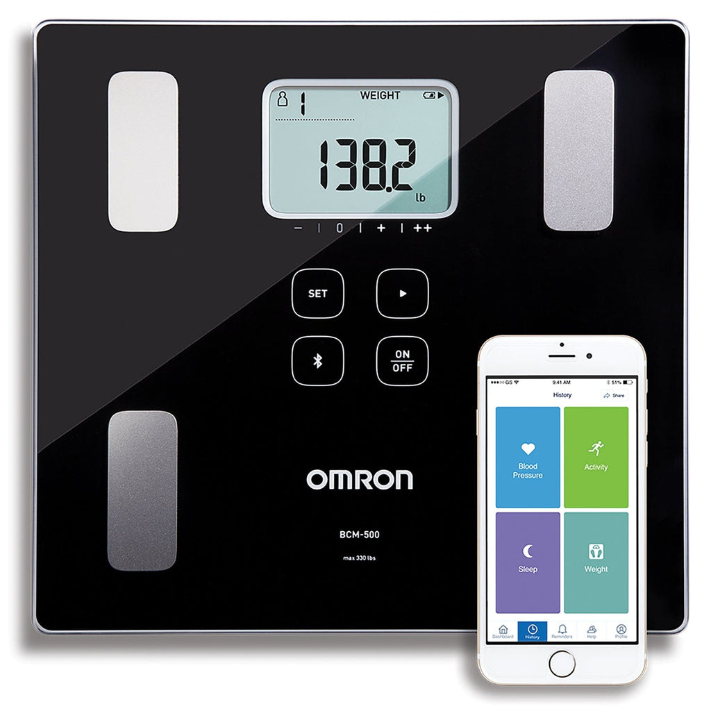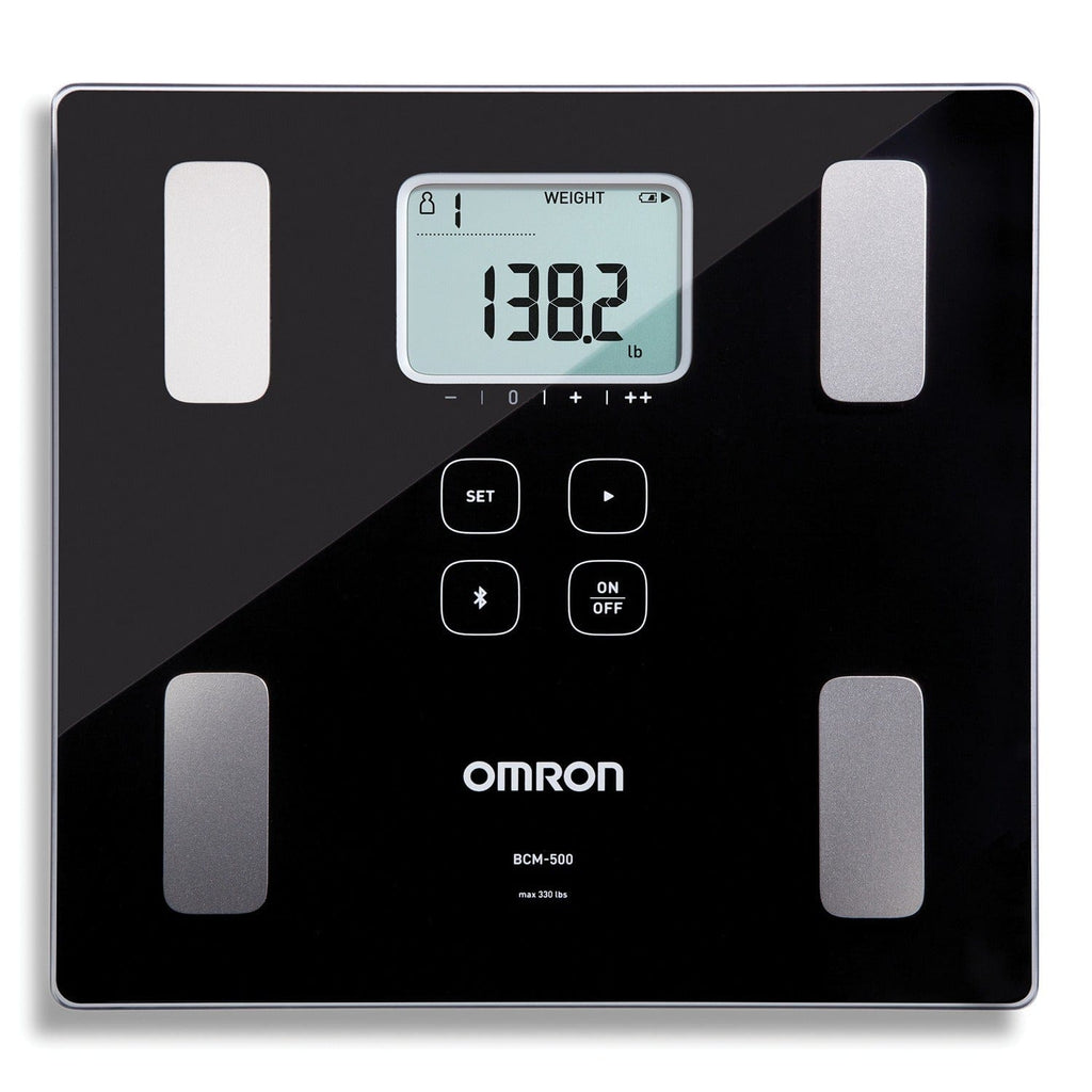 The Omron Body Composition 330-lb Capacity Bathroom Scale with Bluetooth Connectivity performs smart tracking of 6 body metrics: Body Weight, Body Fat percentage, Visceral Fat, Skeletal Muscle percentage, Resting Metabolism, and Body Mass Index (BMI). This Omron monitor and scale stores up to 120 total readings to track up to 4 users’ metrics, but you can also download the free Omron HeartAdvisor app for unlimited memory on your iOS or Android devices. Easy to use, this Omron body composition monitor and scale can be used by adults up to 330 lbs. and 6.5 ft. tall. It features an easy-to-read LCD display, a 4-person memory profile for the whole family to use, as well as a guest mode.