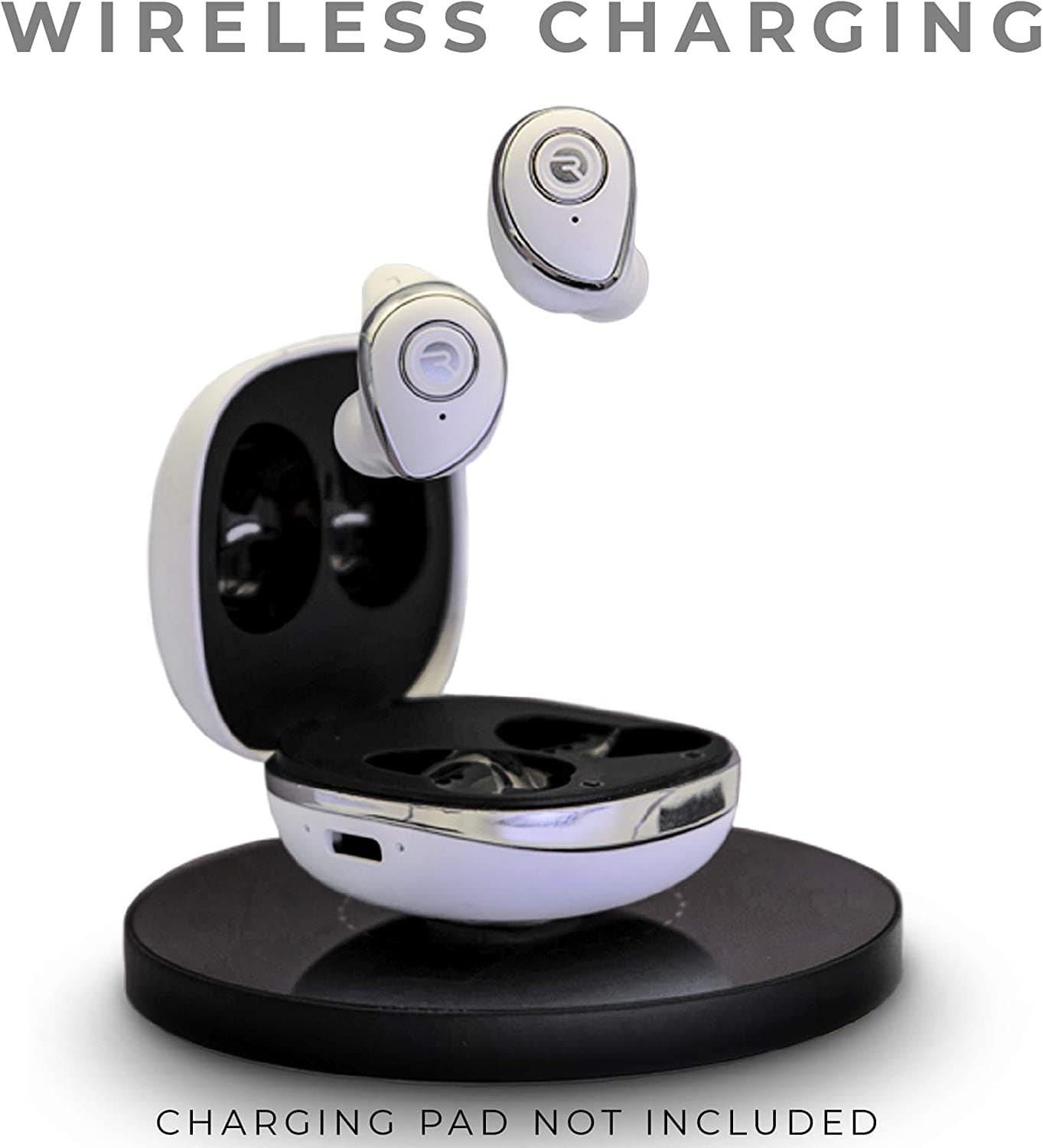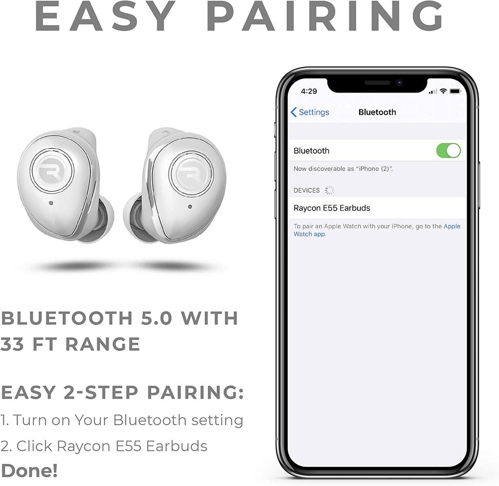Raycon the performer e55 true wireless earbuds rich high-fidelity sound Designed by platinum artists and incorporating actual customer feedback, The Performer E55 delivers expertly balanced high-fidelity sound. Bass boosted audio cores are combined with the latest chipset to keep you tuned in to your favorite music and podcasts throughout the day. Arc-shaped frame for comfortably secure fit a build that literally bends to your needs. The curvature of The Performer E55 is designed to match the natural form of the human ear for the best possible fit. Paired with the right selection from one of our five sizes of gel tips (included with each purchase), you'll forget you're even wearing earbuds. Easy to pair Comes with Bluetooth 5.0 and can easily be paired with any Bluetooth enabled devices at a distance of up to 33 feet away. Wireless charging case The charging case offers up to 40 hours of battery life and can be wirelessly charged or charged with the included charging cable. These earbuds will last overnight and then some. The case is fully compatible with a Qi-compatible charging mat so you can charge on-the-go.