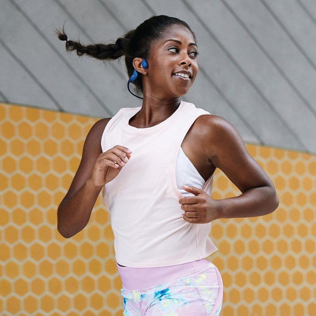 Redefine your possible with Shokz OpenRun bone conduction headphones! Formerly called Aeropex, these open ear headphones are designed for endurance athletes. Unlike traditional in-ear headphones, OpenRun features the signature Shokz open-ear design to keep you tuned in to your music and your outside moments. The enhanced audio on these wireless sport headphones features ensure clear sound, powerful volume, and a rich bass while you’re listening. OpenRun Bluetooth headphones are both lightweight and durable for comfortable all-day use. And they can also withstand the elements. Their IP67 waterproof rating makes OpenRun ideal for sweaty and rainy workouts, although they are not designed for underwater swimming. Embrace a new challenge with these Blue sport headphones powered by Shokz.