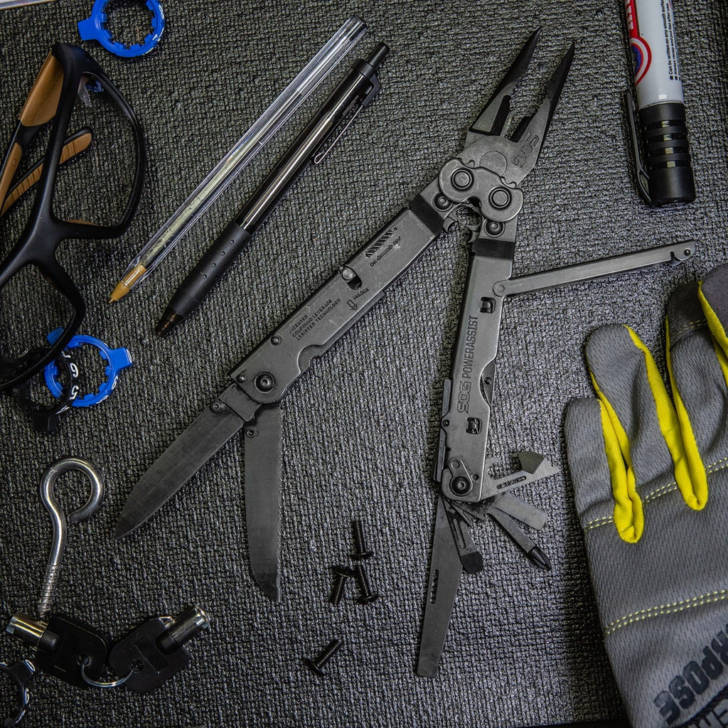 The SOG PowerAssist takes multi-tools to a new level. This is the first in the world to house not just 1 but 2 SOG Assisted Technology (S.A.T.) blades. Start to open the main blades, which are available when the main tool is closed, and S.A.T. takes over to complete opening. When not in use, these blades lock closed using our patent-pending side release. Flip open the tool and experience the precision of the heavy-duty plier capability and large wire cutters. Smooth handle surfaces promote comfort on even the toughest jobs. The multi-tool also includes Compound Leverage gear covers, heavy-duty construction, V-Cutter, built-in crimpers, and a matte black finish for low reflectivity.