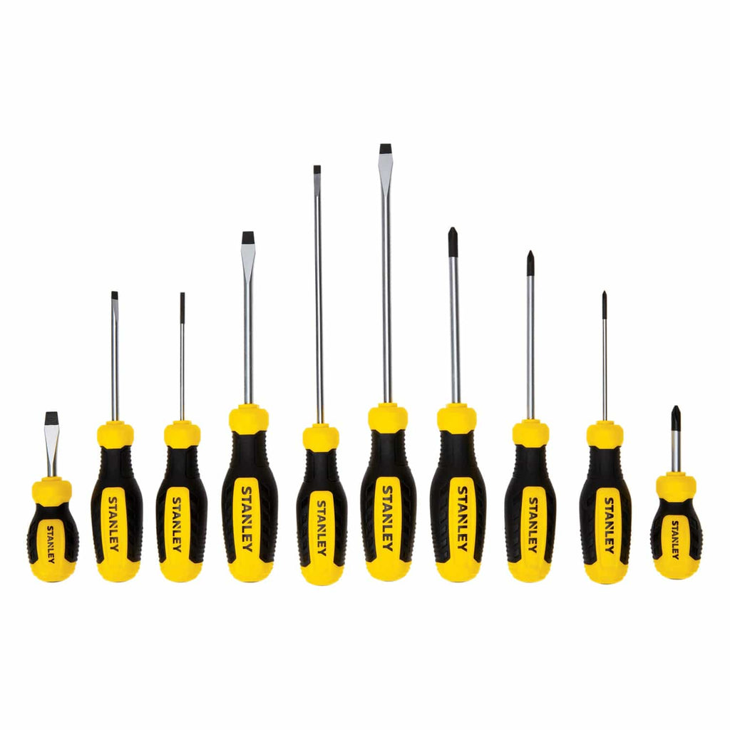 Ensure the tool you need is at your fingertips with the STANLEY 10-Piece Screwdriver Set. Featuring multiple tip types to accommodate a wide range of fastening needs, each screwdriver has a molded, bi-material handle with 3 grip zones to accommodate precision, torque, and speed applications. The tip type is conveniently identified on the handle so you can grab it and get to work with tools you can depend on.