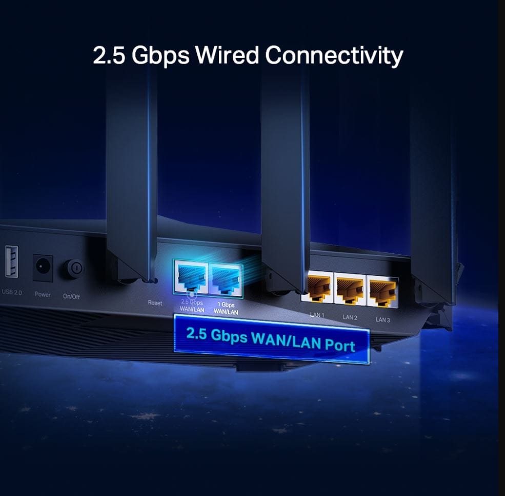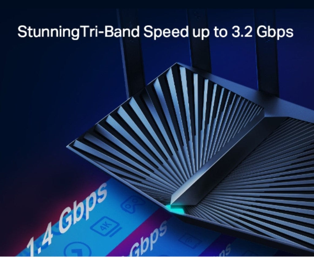Faster AX3200 Tri-Band Wi-Fi – 1440 Mbps (5 GHz) + 1201 Mbps (5 GHz) + 574 Mbps (2.4 GHz).