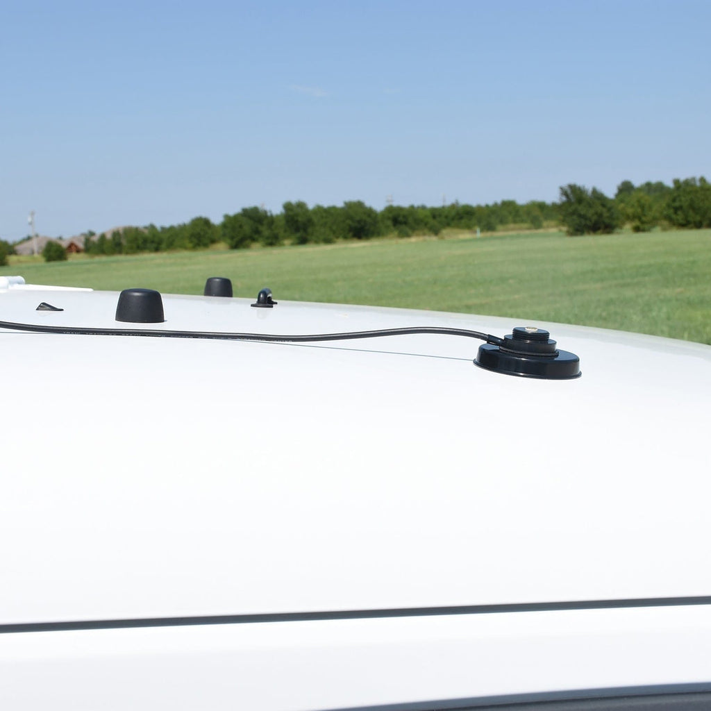 The 3-1/4 In. NMO Magnet Mount from Tram features a gold contact pin and 17 ft. RG58 coaxial cable with copper stranded center conductor and a UHF/PL-259 connector. The magnet housing is made from black zinc.