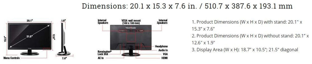ViewSonic VA2265SMH-R 22" 1080p LED Monitor HDMI, VGA - C Grade Refurbished *Certified Factory Recertified, 90 Day Warranty - Product has minor scratches and/or blemishes. Features SuperClear MVA technology for stunning color performance and wide-angle viewing Versatile connectivity options include HDMI and VGA Full HD1080p resolution provides superior pixel performance Exclusive ViewMode technology delivers superior color rendering and intuitive settings Flicker-free and Blue Light Filter technology for more comfortable viewing. Description The ViewSonic VA2265Smh is a 22” (21.5” viewable) widescreen monitor with an LED backlight and glossy, thin-bezel design ideal for both work and entertainment. With the latest ViewSonic SuperClear MVA panel technology and 3000:1 static contrast ratio, the VA2265Smh delivers stunning screen performance at nearly any viewing angle. Paired with versatile input options including future-proof HDMI and VGA, the monitor allows flexible connection to PC systems, laptops, and other entertainment devices. As a complete multimedia package, the monitor also includes a pair of integrated speakers for excellent audio performance. ViewSonic’s exclusive ViewMode feature provides intuitive presets that deliver optimized screen performance in different applications. In addition, Flicker-Free technology and a Blue Light Filter help to eliminate eye strain from extended viewing periods. A VESA-mountable design offers additional mount flexibility. In addition, a 3-year limited warranty, along with one of the industry’s best pixel performance policies, provides great value for the stylish, high-performance VA2265Smh monitor. SuperClear® MVA Panel Technology 178°/178° Ultra-wide viewing angle Enjoy accurate and vivid colors with consistent levels of brightness no matter the vantage point. With SuperClear MVA panel technology, this monitor delivers the same image quality whether you are looking at the screen from above, below, the front, or the side. The Power of HDMI® HDMI Connectivity HDMI is a future-proof video standard that delivers true digital picture and audio clarity. The HDMI interface on this monitor allows you to connect to a variety of HD devices including gaming consoles, Blu-ray players, laptop PCs, digital cameras, and many others for the ultimate true high-definition experience. Full HD 1080p Resolution 1080p Full HD This monitor features Full HD 1920x1080 resolution for unbelievable pixel-by-pixel image performance. You’ll experience the most amazing clarity and detail whether it be while working, gaming, or enjoying the latest in multimedia entertainment. Optimized View Settings 5 Settings Optimized performance ViewSonic’s unique ViewMode™ feature offers “Game,” “Movie,” “Web,” “Text,” and “Mono” presets. These presets enhance gamma curve, color temperature, contrast, and brightness to deliver an optimized viewing experience for different screen applications. Enhanced Viewing Comfort Flicker-free Minimized screen flickering Blue Light Filter Reduced blue light Flicker-Free technology and a Blue Light Filter help to eliminate eye strain from extended viewing periods. VESA-Compatible Mount Design Mount the monitor as you see fit using its convenient 100 x 100mm VESA-compatible mount design. Better Color Depth An ultra-high static contrast ratio offers a wider range of grayscale to show deeper, richer colors with more visible details in shadows and highlights. Lower Energy Consumption With an energy-saving Eco-mode feature and ENERGY STAR 6.0 compliance, this monitor delivers great power savings along with its stunning screen performance. Dual Integrated Speakers Designed with dual integrated speakers, this display combines incredible screen performance with stereo sound for an immersive multimedia experience. An additional speaker can be added via the SPDIF audio-out port for expanding sound to different locations in the room or venue, via cable. Specifications Display: Display Size (in.): 22 Viewable Area (in.): 21.5 Panel Type: MVA Resolution: 1920 x 1080 Static Contrast Ratio: 3,000:1 Light Source: LED Brightness: 250 cd/m2 Colors: 16.7M Response Time (Typical GTG): 6.5ms Viewing Angles: 178º horizontal, 178º vertical Backlight Life (Hours): 40,000 Panel Surface: 3H Anti-glare, hard-coating Compatibility: PC Resolution (max): 1920 x 1080 non-interlaced Mac® Resolution (max): 1920 x 1080 Connector: 3.5mm Audio In(1), 3.5mm Audio Out(1), HDMI(1), VGA(1) Audio: Internal Speakers: 1.5-watt (x2) Power: Eco Mode (Conserve): 13W Eco Mode (optimized): 17W Consumption (typical): 22W Consumption (max): 30W Voltage: AC 100-240V (universal), 50-60Hz Additional Hardware: Kensington Lock Slot: 1 Controls: Physical Controls: 1, 2, Down, Up, Power On Screen Display: Auto Image Adjust, Contrast/Brightness, Input Select,Audio Adjust, Color Adjust, Information, Manual ImageAdjust, Setup Menu, Memory Recall(See user guide for complete OSD functionality Operating Conditions: Temperature: 32-104º F (0 - 40º C) Humidity (non-condensing): 20-90% Mount: VESA Compatible: 100 x 100 mm Video Signal: Frequency Horizontal: 24~82kHz Frequency Vertical: 50~75Hz Video Input: Analog Sync: Separate Sync, Composite Sync, Sync on Green Ergonomics: Tilt (Forward/Back): 5º / 20º Weight (imperial): Net (lbs): 7.9 Net Without Stand (lbs): 6.7 Gross (lbs): 10.2 Weight (metric): Net (kg): 3.6 Net Without Stand (kg): 3 Gross (kg): 4.6 Dimensions (imperial) (WxHxD): Packaging (in.): 22.4 x 15.0 x 5.0 Physical (in.): 20.1 x 15.3 x 7.6 Physical Without Stand (in.): 20.1 x 12.6 x 1.9 Dimensions (metric) (WxHxD): Packaging (mm): 569 x 382 x 128 Physical (mm): 510.7 x 387.6 x 193.1 Physical Without Stand (mm): 510.7 x 319.4 x 47.2 General: Regulations: CE, CB, WEEE, RoHS, TCO 6.0, Erp, WHQL, WIndows8, Windows 7 cUL,ENERGY STAR, FCC-B, EPEAT Silver, UL-MX-CoC, Mexico Energy Package Contents: VA2265Smh monitor, Power cable, VGA cable, Quick Start Guide Recycle/