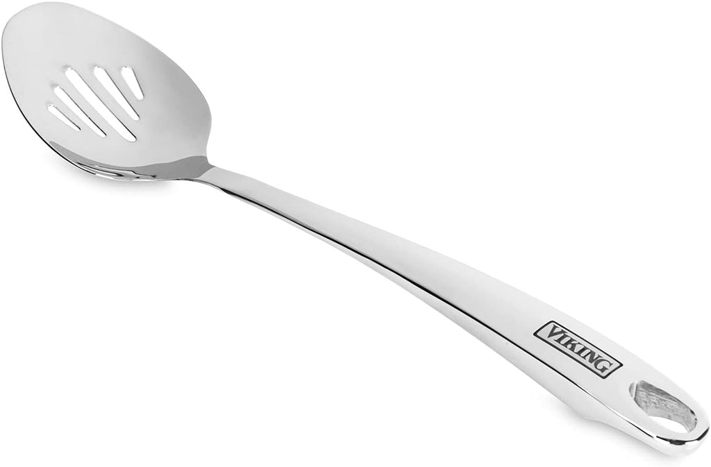 Add essential tools to your home kitchen and elevate your meal preparation with the Viking 6 Piece Stainless Steel Kitchen Utensils Set. This comprehensive cooking utensil set include slotted and solid spoons, slotted and solid spatulas, pasta fork, and a deep ladle, each thoughtfully designed to increase kitchen efficiency. Each utensil is constructed with an ergonomic hollow handle which provides a comfortable grip while working in the kitchen for prolonged periods of time. Each kitchen utensil is constructed with durable nonreactive 304 stainless steel for long-lasting reliability, and features a sleek mirror-polished silver polish for a nice visually striking complement to contemporary home kitchen settings. This kitchen essentials set features a seamless design which allows for easy washing by hand with warm and soapy water, and is also dishwasher safe for added convenience. This kitchen tool assortment makes for an excellent birthday, holiday, anniversary, or everyday gift for the kitchen enthusiast in your life. Whether you’re flipping pancakes or stirring a savory stew, our kitchen utensil set is essential for serving up your next culinary masterpiece.