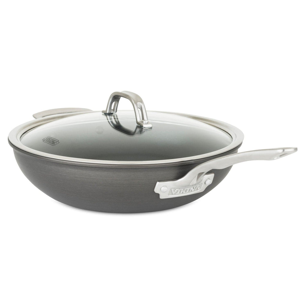 Experience even heat and exceptional release with Viking Hard Anodized Nonstick Cookware. Constructed with heavy gauge anodized aluminum for durability and even heat distribution throughout the sides and bottom of the pan, Viking Hard Anodized Cookware features a stainless steel base making it exceptionally stable and compatible with all cooktops including induction. Accepted worldwide as one of the most conductive metals for cooking, the aluminum is strengthened through the anodizing process until it is twice as hard as stainless steel, giving you durability without giving up conductivity. Featuring a titanium infused Triple-layer nonstick for superior release, durability and longevity even when using metal utensils. The multi-layer coating improves release and protection even if the top layer is scratched over time. The fry pans feature flared rims for easy tossing and drip-free pouring. Viking signature handles are hand crafted from cast stainless steel and riveted to the pan for a lifetime of durability. Handles feature heat breaks to help them stay cool on the cooktop during use. Long handles feature a finger stop that guides your hand to the perfect grip for comfort, balance and control. Viking Hard Anodized Cookware can be used on all cooktops, including induction, in the oven, or on the grill up to 500°F, making it perfect for finishing dishes the same way a professional chef does. Viking Hard Anodized Nonstick Cookware is dishwasher safe, but we recommend hand washing to extend the life of the nonstick and to keep your cookware looking new. Viking Hard Anodized Nonstick Cookware is backed by a limited lifetime warranty.