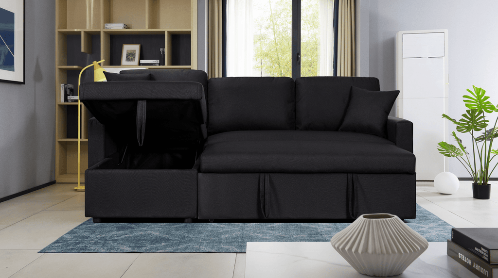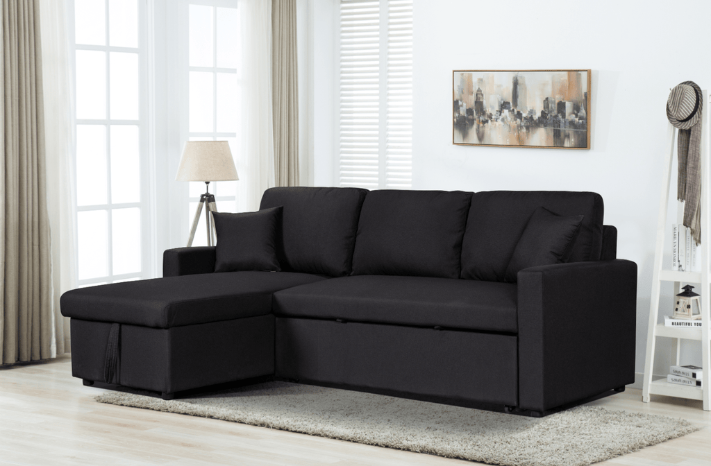 Limited in living space? The Paisley Collection is the perfect choice for you! This two-piece reversible sectional couch is easy to assemble for the chaise to be on either side. A functional and stylish piece for your small living space with its pull-out bed, spacious storage chaise, two matching throw pillows, and quality linen fabric. Welcome this simple yet comfortable and functional sofa into your home for you and your guest to enjoy entertainment together!