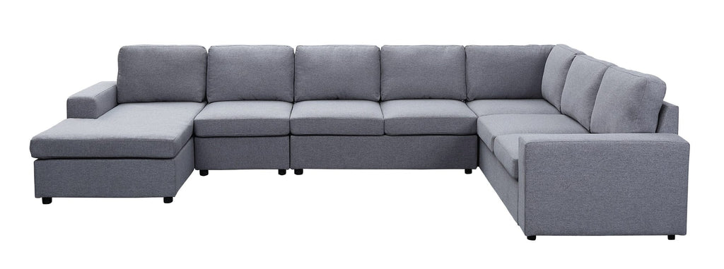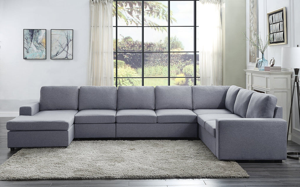 Sit back and relax in the Tifton Collection! Crafted from solid wood and fine fabrics, this 6 piece Modular Sectional Sofa with Reversible Chaise will welcome you and your guests to enjoy your activities in style and comfort. Clean and Simple with generous amounts of space, this European Style is a timeless look and is the leader of furniture trends.