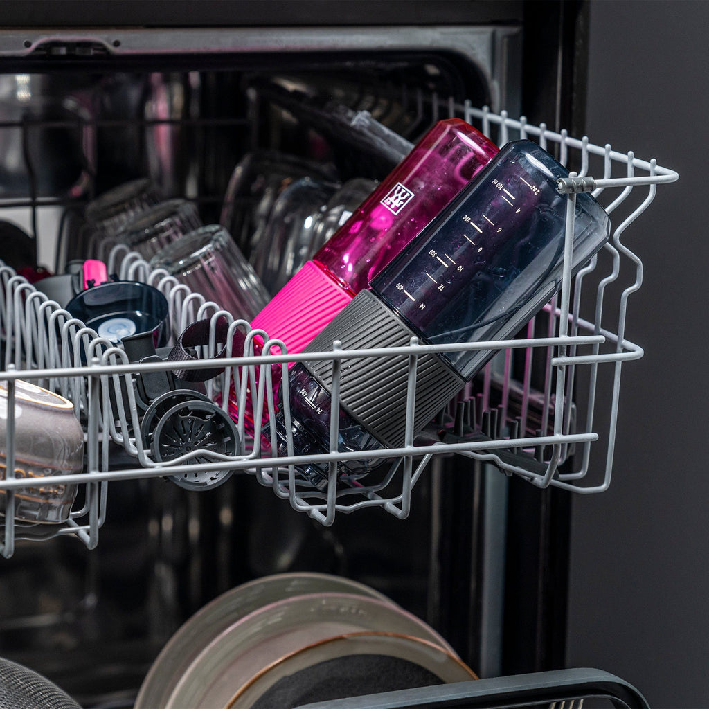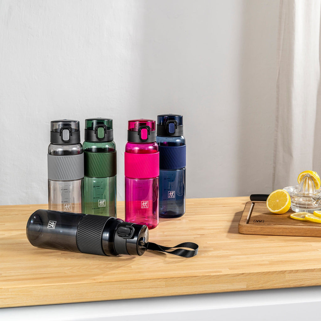 Stay Hydrated, On the Field and On the GoWhether you’re hiking the hills, heading out to work, or kicking the ball around the field, these colorful water bottles are the perfect companion, keeping you hydrated on the go. Made of durable, BPA-free Tritan plastic, they are lightweight, odorless, and won’t affect the taste of water or any other refreshing drink you fill them with. And with a secure safety lock, you never have to worry about accidental openings.The ZWILLING Water Bottles feature a host of thoughtful design features, including a convenient one-hand open and close mechanism, a silicone sleeve that ensures a comfortable, secure grip, a diameter that ensures a perfect fit in most car cup holders, and a handy strap for easy toting. Also included with the bottle is a removable strainer to keep ice and flavorings like lime and lemon away from the spout when you are drinking.Available in 5 rich hues, you can choose a color for each member of the family. Dishwasher safe removable parts make clean up a cinch.